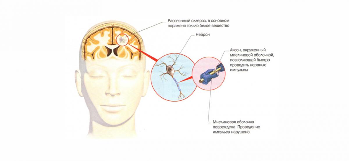 Если происходит разрушение этой миелиновой оболочки (демиелинизация)(хотелось бы сразу здесь прочитать и про причину, но, видимо придётся написать о ней в выводах) , то это приводит своеобразному «пробою изоляции» и потере нервных импульсов, что в свою очередь является толчком к развитию ряда тяжелых заболеваний (к примеру - рассеянного склероза).